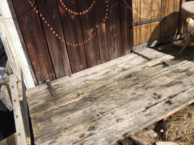 När jag flyttade hit 2005 skaffade jag en kompostbehållare – Mullbanken. Då fanns den fortfarande i obehandlat skick utan giftig tryckimpregnering. Efter 10 år hade den blivit sliten och söndegnagd på ena sidan så mössen kunde ta sig in och möss vill jag inte odla. Jag sågade till ett par brädlappar och spikade dit.