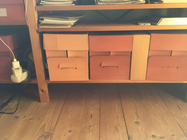 Att köpa kartonger för förvaring i inredningsbutiker är onödigt när man kan få kartonger alldeles gratis. Jag målar dem med filmjölksfärg (filmjölk och jordpigment).