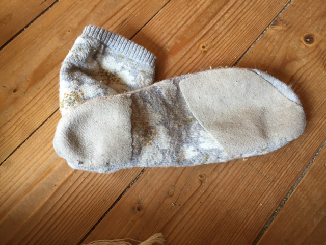 Jag fick ett par fina yllesockor av en vän. För att inte slita ut dem på något år så sydde jag på ullbitar där de slits mest. Där stortånageln går emot har jag limmat fast en ullbit.