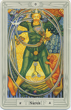 Till skillnad från dessa, på ytan ganska enkla narrar ser Crowleys narr (1990-talet), i sitt överlastade symbolspråk oerhört komplex ut. Crowleys narr har grön dräkt och är behornad vilket förbinder honom med växtriket och guden Pan, sexualitet, fruktbarhet och allt som växer. Men Crowley förbinder också narren med Dionysus genom vindruvor och murgröna.