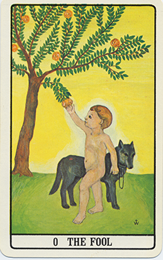 Wang har i sin narr i Order of the Golden Dawns lek tagit fasta just på Horusbarnet. Wangs nakna barn-narr indikerar både det oskyddade och det oskuldsfulla. Följeslagaren är en varg - vargen som förgörare men till skillnad från de tidigare beskrivna korten är följeslagaren här bunden till narren med ett koppel.